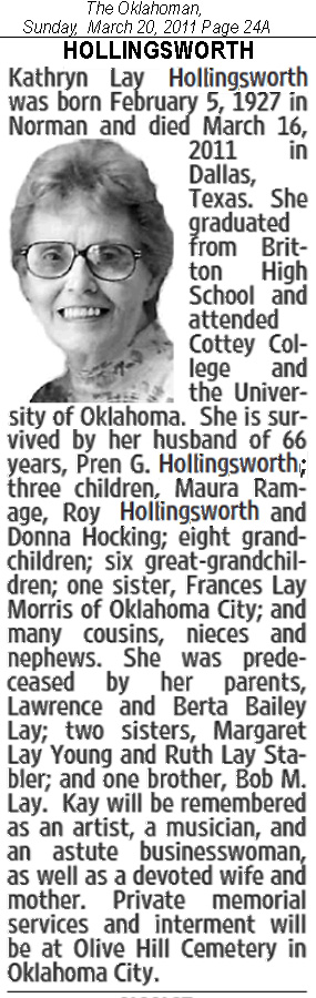 Oklahoma University, where she met and married her soul-mate, Pren Hollingsworth.
